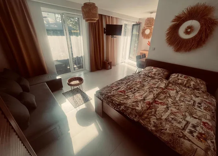 Das 30 m^2 große Chill Out Apartment - Niezalezne Wejscie Z Prywatnym Parkingiem I Patio mit Blick auf den Garten bietet seinen Gästen WLAN und private Parkplätze vor Ort. Kosciol Matki Bozej Gwiazdy Morza liegt lediglich 7 Gehminuten von dem 1-Zimmer-Apartment entfernt, während die Bushaltestelle Uniescie in einem 5-minütigen Spaziergang zu erreichen ist.